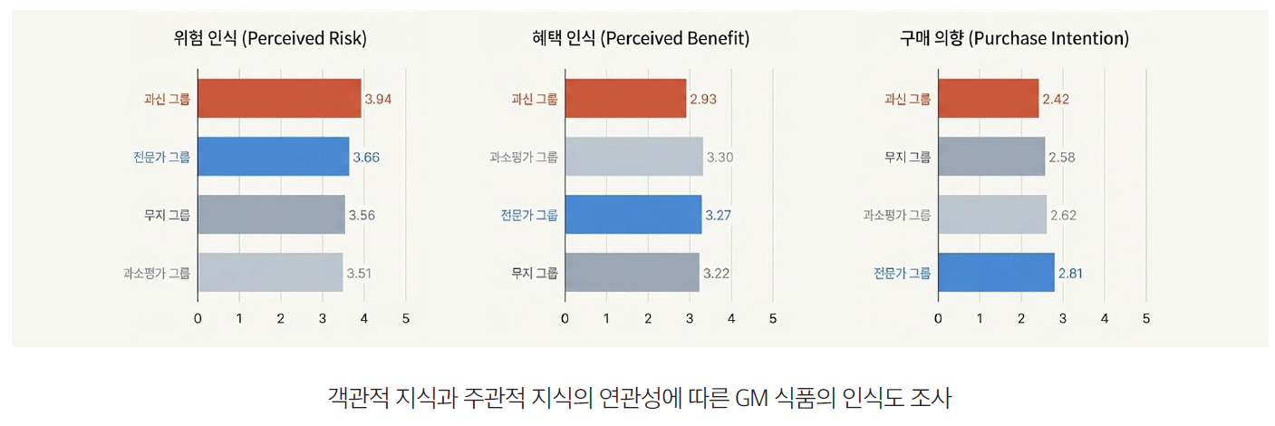 연구자들은 시민들의 GM 식품에 대한 지식 정도를 조사하는 과정에서 결정적 단서를 하나 찾아냈다. 바로 지식이 단일하지 않다는 사실이었다. 사람들이 무엇에 대해 ‘안다’고 느낄 때, 이는 사실 객관적 지식과 주관적 지식이 혼재된 경우가 많다. 객관적 지식 (Objective Knowledge)이 ‘검증 가능한 사실에 대한 실제 이해도’를 의미한다면, 주관적 지식(Subjective Knowledge)이란 ‘스스로가 얼마나 안다고 여기거나 느끼는지에 대한 자신감이나 믿음’에 가깝다. 사람에 따라 객관적 지식과 주관적 지식은 일치하기도 하고, 그렇지 않기도 하는데, 그 정도에 따라 네 그룹으로 나눌 수 있다. 우리나라 국민 1,000명을 대상으로 GM 식품에 대한 지식의 정도를 조사한 연구 결과10) 뜻밖의 사실이 하나 밝혀졌다. 네 그룹의 사람들 중, GM 식품에 대해 가장 부정적인 견해를 보이는 그룹은 GM 식품에 대해 잘 모른다고 대답한 무지 그룹이 아니라, 스스로가 알고 있는 것에 비해 더 많이 알고 있다고 자부하는 과신 그룹(Overestimation Group)이었다. 과신 그룹은 GM 식품의 위험도, GM 식품이 주는 혜택, GM 식품의 구매 의향에 대해서 일관적으로 가장 부정적인 성향을 나타냈다.