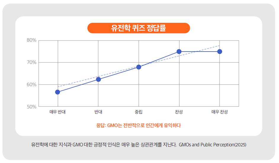 앞서 과학적 쟁점에 대한 과학자와 시민의 인식에서 드러난 패턴이 너무도 뚜렷했기에, 그 원인 역시 분명해 보였다. 과학자들 역시 시민의 일부이기에, 과학자와 일반 시민을 가르는 기준은 해당 분야에 대한 전문적 지식의 정도 차이였다. 따라서 해당 조사에서도 설문에 답한 과학자들의 84%는, 시민들의 과학지식 부족이 부정적 인식의 근본이라고 여기고 있었다. 실제로 과학지식의 부족은 GM 식품에 대한 막연한 공포와 반감의 한 축이 되며, 충분한 지식은 인식 개선의 효과가 있음을 증명한 연구6)도 있다. 이에 따르면, 무작위로 선택된 대학생들에게 기초적 유전학 문제를 풀게 했을 때, 정답률과 GMO에 대한 긍정적 인식 사이에는 매우 높은 상관성이 있음이 뚜렷하게 드러났다. 또한 이들에게 정확한 유전적 지식을 갖추게 하자, GMO에 대한 관점 역시도 긍정적인 쪽으로 이동하는 것이 보였다. 사랑은 앎에서 나오며, 알지 못하면 사랑할 수도 없다는 레오나르도 다 빈치의 명언은 그 대상이 무엇이든 관계없이 언제나 진실인 셈이다.