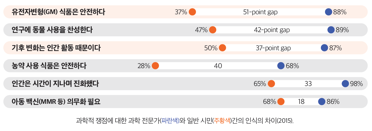 동일한 대상을 바라보는 전문가와 비전문가, 혹은 과학자와 일반 시민들의 인식이 서로 상반되는 경우는 드물지 않다. 그럼에도 불구하고 동일한 과학적 쟁점에 대해 전문가 그룹과 시민 그룹의 관점에 대해 비교분석한 퓨 리서치 센터(Pew Research Center)와 미국과학진흥협회(AAAS)1)(2015)의 연구 결과는 의미심장하다. 해당 조사에서는, 총 13가지의 과학적 쟁점에 대해 과학자들과 시민들의 관점을 비교하여 분석했는데, 주제에 따라 정도는 조금씩 달랐으나, 기본적으로 시민 그룹은 과학자 그룹에 비해 해당 주제를 부정적으로 인식했다. 그리고, 이 13개의 질문 중 과학자와 시민 그룹 사이의 의견 불일치도가 가장 높았던 것이 바로 GM 식품의 안전성에 대한 견해였다. 과학자들은 GM 식품이 안전하다는데 88%가 동의한 반면, 시민 그룹은 겨우 37%만이 긍정적인 반응을 보여 그 격차가 51%나 벌어졌다.