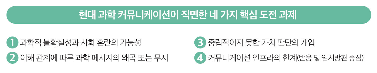 과학 분야의 커뮤니케이션 생태계가 빠르게 변화 중이다. 유전자 편집이나 인공지능(AI) 같은 과학적 돌파구들은 엄청난 잠재력을 가졌지만, 동시에 사회적 영향에 대한 거대한 불확실성을 안고 있다. 만약 의도치 않은 부정적 결과가 발생하면 그 대가는 너무 클수 있다. 이러한 문제의식 때문에 학계에서도 근거 기반의 과학 커뮤니케이션 연구가 다시 주목받기 시작했다.