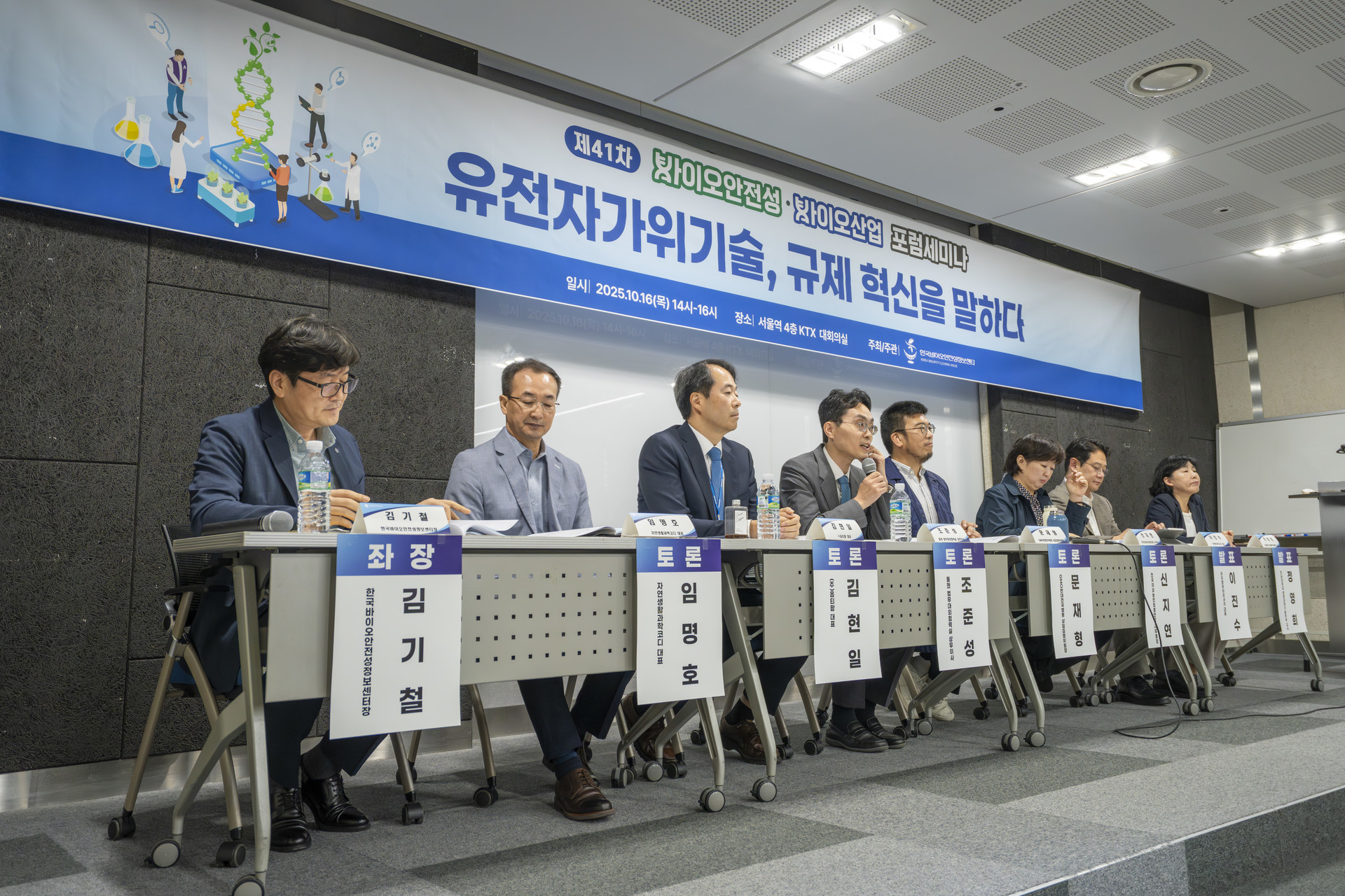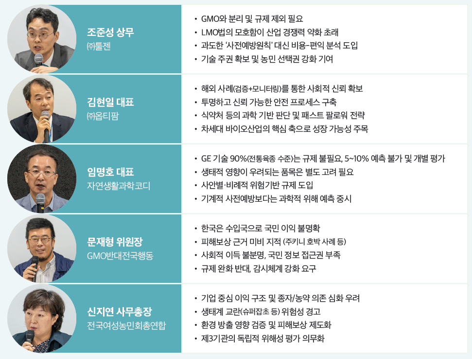 주제 발표 후 산업계, 학계, 시민사회 등 다양한 분야의 패널 토론이 이어졌다. 토론에는 주제 발표자 2인 외에 ㈜툴젠 조준성 상무, ㈜옵티팜 김현일 대표, 자연생활과학코디 임명호 대표, GMO반대전국행동 문재형 위원장, 전국여성농민회총연합 신지연 사무총장이 참석했다. 한국바이오안전성정보센터 김기철 센터장은 좌장을 맡아 토론을 진행했다.