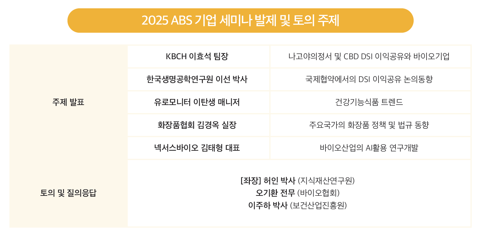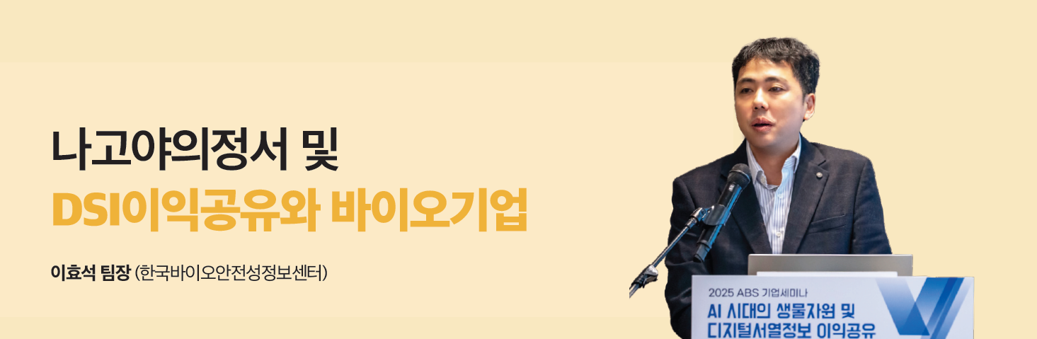 한국바이오안전성정보센터의 ABS 기업세미나가 지난 11월 26일 서울 종로에 위치한 서머셋 팰리스 호텔에서 진행됐다. ABS 관련 국제 협약에 대한 국내 기업 및 연구자의 실무 대응 전략을 논의하는 ABS 기업 세미나의 이번 주제는 AI 시대의 생물자원 및 디지털서열정보(DSI) 이익공유였다. AI를 활용한 합성생물학의 빠른 발전에 따른 시대적 변화에 맞추어 DSI 이익공유 체계와 각국의 제도화 사례를 살펴보는 것을 비롯해, 국내 바이오기업의 ABS 이행 사례, 건강기능식품 및 화장품 관련 정책과 시장 동향, AI 활용 연구 사례 등을 함께 살펴보는 시간으로 꾸려졌다.