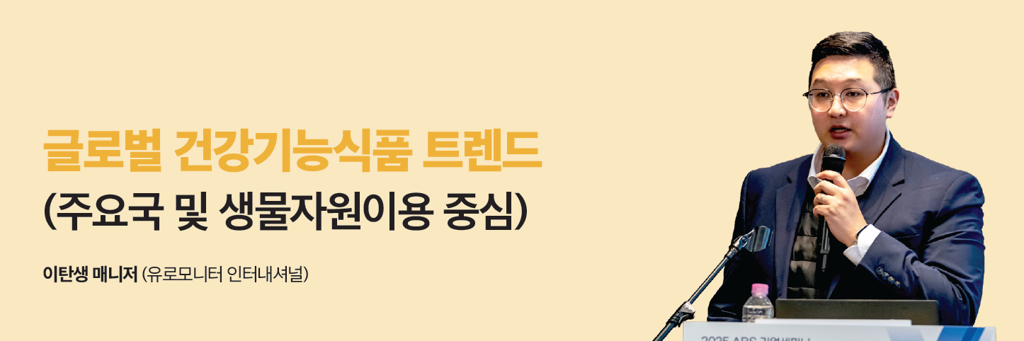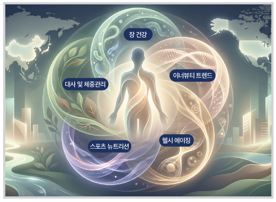 글로벌 시장의 주요 트렌드로는 첫째, 장 건강 제품이 핵심 성장 축으로, 프로바이오틱스, 프리바이오틱스, 포스트바이오틱스 등 미생물 기반 및 유래 성분들이 식품과 음료에 결합되어 일상 섭취 형태로 확산되고 있다. 둘째, 이너뷰티 트렌드가 아시아를 넘어 글로벌로 확산되면서 콜라겐 중심에서 레티놀, 펩타이드 등 특정 생물 유래 성분들이 경구용 제품으로 확장되고, 노화 방지뿐 아니라 자외선 차단, 피부 톤 개선 등 세분화된 효능 중심으로 진화하고 있다. 셋째, 헬시 에이징 수요는 젊은 세대의 미래 질병 예방과 고령층의 관절·시력·수면 문제 해결에 초점을 맞추며 생물학적 노화 지표 개선 및 면역 강화에 중점을 둔 천연물 기반 프로그램형 제품을 등장시키고 있다. 넷째, 스포츠 뉴트리션이 단백질, 비타민 등 기본 영양을 넘어 면역력, 장 건강, 스트레스 완화 등 다양한 기능이 결합된 제품으로 확장되고 있으며, 다섯째, GLP-1 계열 체중감량 약물 확산에 따라 실제 복용자 대상의 보조 제품과 함께 천연 성분으로 유사 효과를 내는 부스터 제품이 성장하고 있다. 건강기능식품 산업은 기능 중심에서 소비자 중심으로 이동 중이다. 다양한 기능성 성분들을 활용하여 여러 건강 니즈를 통합하는 복합 솔루션 형태로 진화하는 것이 브랜드 성장의 핵심 방향으로 자리 잡고 있다.