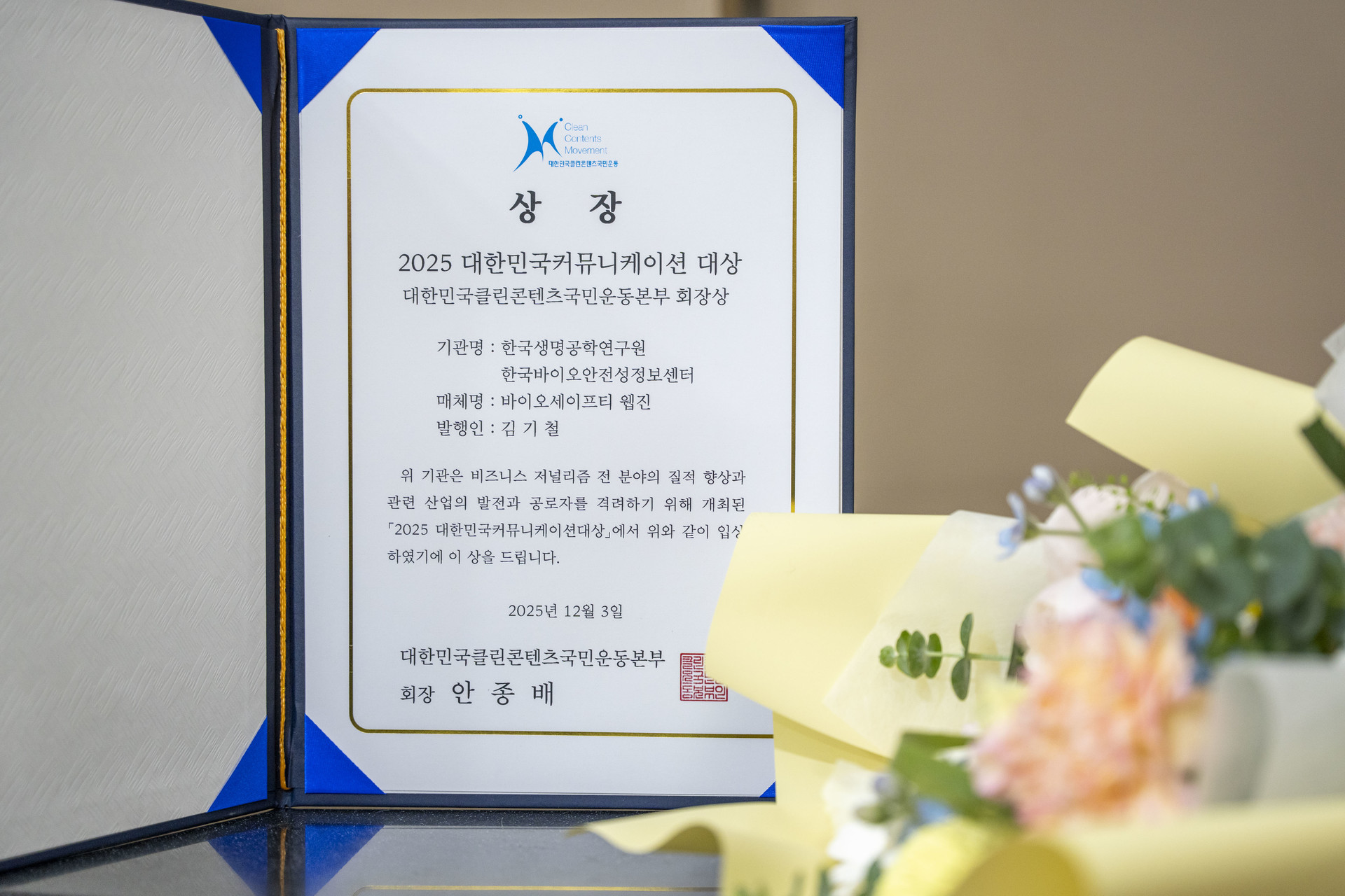 한국바이오안전성정보센터(이하 KBCH)가 발행하는 웹진 <바이오세이프티(Biosafety)>(발행인 김기철)가 지난 12월 3일 한국프레스센터에서 개최된 ‘2025 대한민국 커뮤니케이션 대상’에서 수상의 영예를 안았다. <바이오세이프티>는 대한민국클린콘텐츠국민운동본부 회장상을 수상, 웹진 전환 4년 만에 바이오 분야 전문 정보 및 소통 채널로서의 성과를 이루었다.