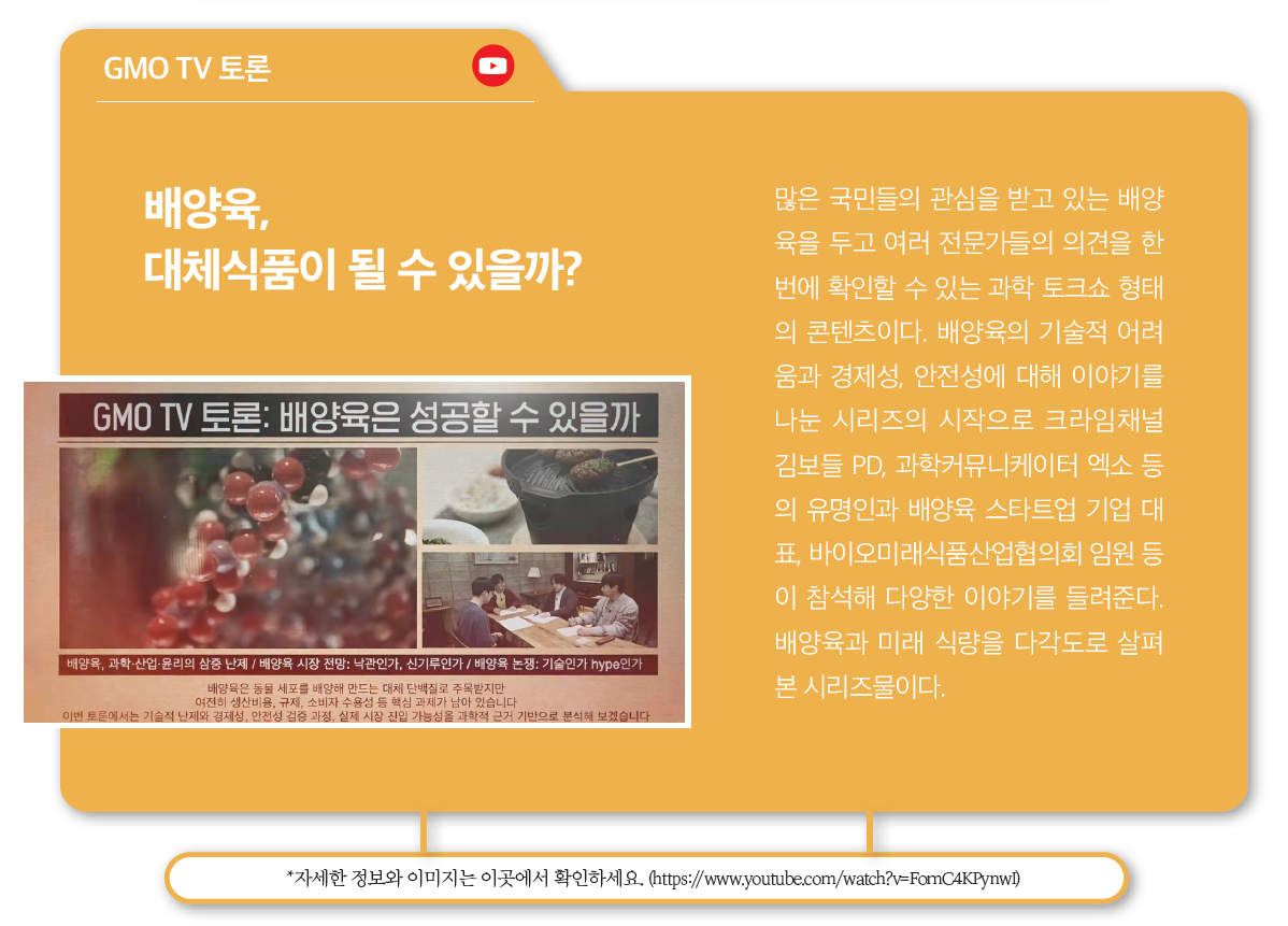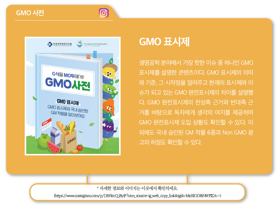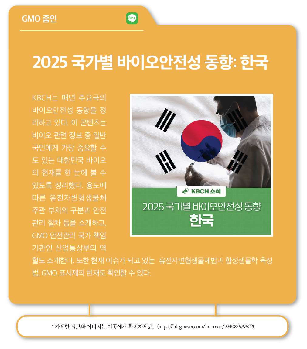 스마트 GMO 리포트는 한국바이오안전성정보센터의 블로그 <ALL about GMO>(http://blog.naver.com/lmoman)와인스타그램<kbch_gmo>(www.instagram.com/kbch_gmo/), 유튜브 채널 <GMO TV>(https://www.youtube.com/@gmotv.KBCH_Official)의흥미로운 콘텐츠들을 모아놓은 코너입니다. 다양하고 재미있는 콘텐츠들을 확인하시고 유익한 정보도 얻어가세요.